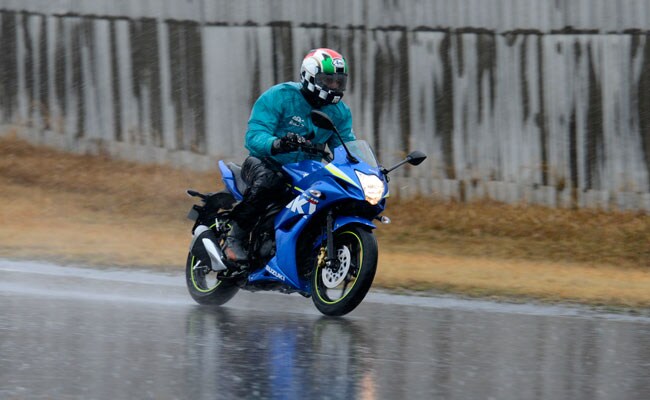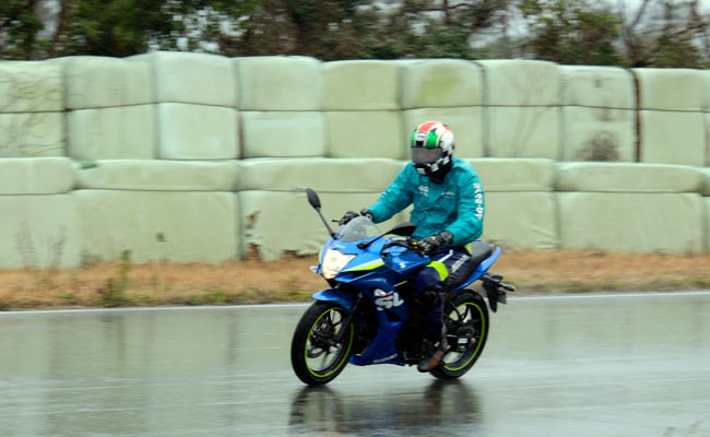 जिस नीले रंग की मोटोजीपी एडिशन को हमने चलाया, उसका लुक मुझे तो अच्छा लग रहा था। डिज़ाइन भी अच्छा कहेंगे। बहुत क्रांतिकारी बदलाव नहीं है, हेडलैंप का शेप वैसा ही है, जो आजकल चल रहा है। बहुत फ़्यूचरिस्टिक बनाने की कोशिश नहीं की गई है। तो आख़िरकार इस नए नवेले रूप में आई जिक्सर एसएफ़ को चलाने का मेरा भी वक़्त आया। बारिश झमाझम थी और तापमान 5 डिग्री से नीचे था और इस बीच सोने पर सुहागा हआ। मैं निकल पड़ा रयूयो टोस्ट ट्रैक पर, लेकिन मौसम ऐसा था कि शुरू में मोटरसाइकिल के बारे में सोचना मुश्किल काम था, क्योंकि पहले यह देखना था कि बारिश में संभलकर कैसे बढ़ा जाए और फिर ठंड में गल्व्स के बावजूद उंगलियां भीग कर जम रही थीं, लेकिन मज़ा तो आ रहा था, क्योंकि हिंदुस्तान में राइडिंग का ऐसा माहौल कहां मिल पाता है।