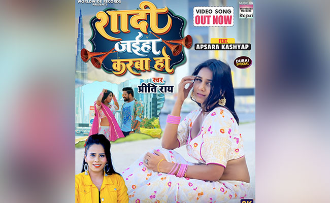 भोजपुरी फ़िल्म जगत की खूबसूरत अप्सरा यानी अप्सरा कश्यप का नया सांग यूट्यूब पर धूम मचा रहा है. इस सान्ग को प्रीति राय ने मदहोश कर देने वाली आवाज में गाया है जिसके बोल हैं 'शादी जईहा करबा हो'. ये सांग भी वर्ल्डवाइड रिकार्ड्स की दुबई सीरीज में से एक है जिसे आप कंपनी के ऑफिशियल यूट्यूब चैनल पर जाकर देख व सुना जा सकता है. सान्ग में अप्सरा के साथ कोरियोग्राफर एक्टर गोल्डी जायसवाल ने कमाल का परफॉर्म किया है.