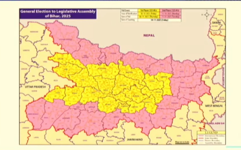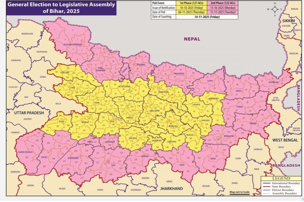 "बिहार चुनाव 2025 दो चरणों में होंगे, पहला चरण 6 नवंबर को, दूसरा चरण 11 नवंबर को होगा, जबकि मतगणना 14 नवंबर को की जाएगी"