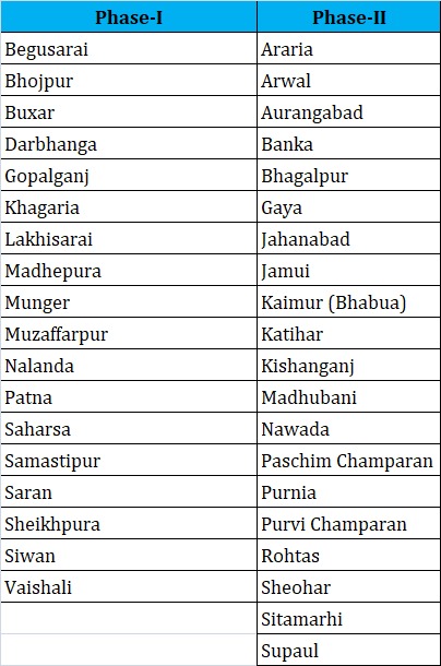 बिहार विधानसभा चुनाव के प्रथम चरण में राज्य के 18 जिलों में मतदान होगा। इन महत्वपूर्ण जिलों की सूची इस प्रकार है: