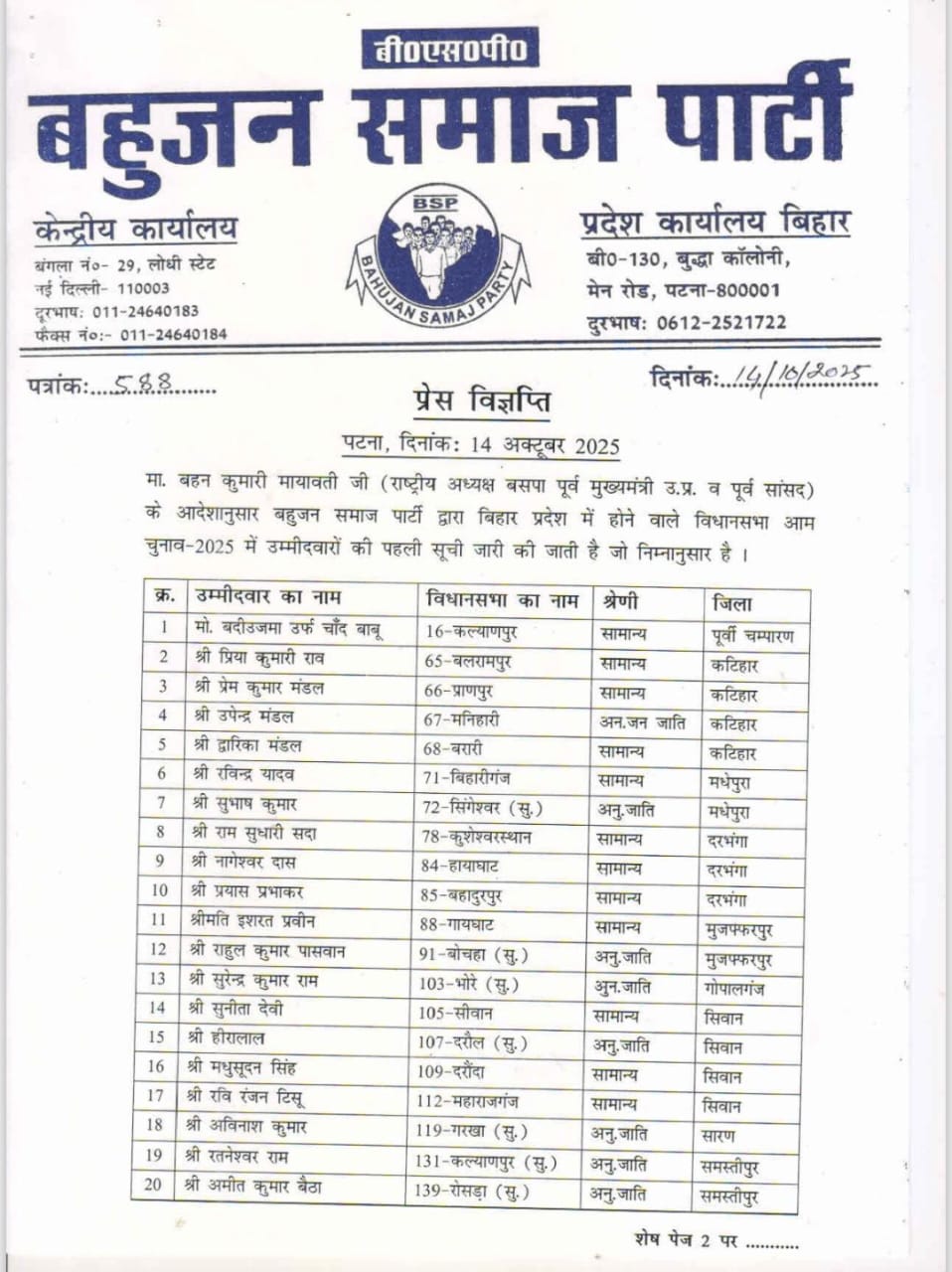 BSP ने भी बिहार चुनाव के लिए जारी कर दिये उम्मीदवारों के नाम