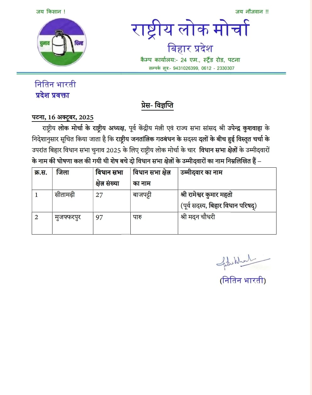 उपेंद्र कुशवाहा ने सभी उम्मीदवारों के नाम की घोषणा की