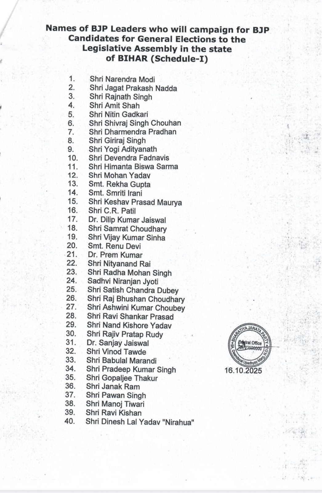 बिहार चुनाव: BJP के स्टार प्रचारकों की लिस्ट जारी, पीएम मोदी सहित 40 नाम