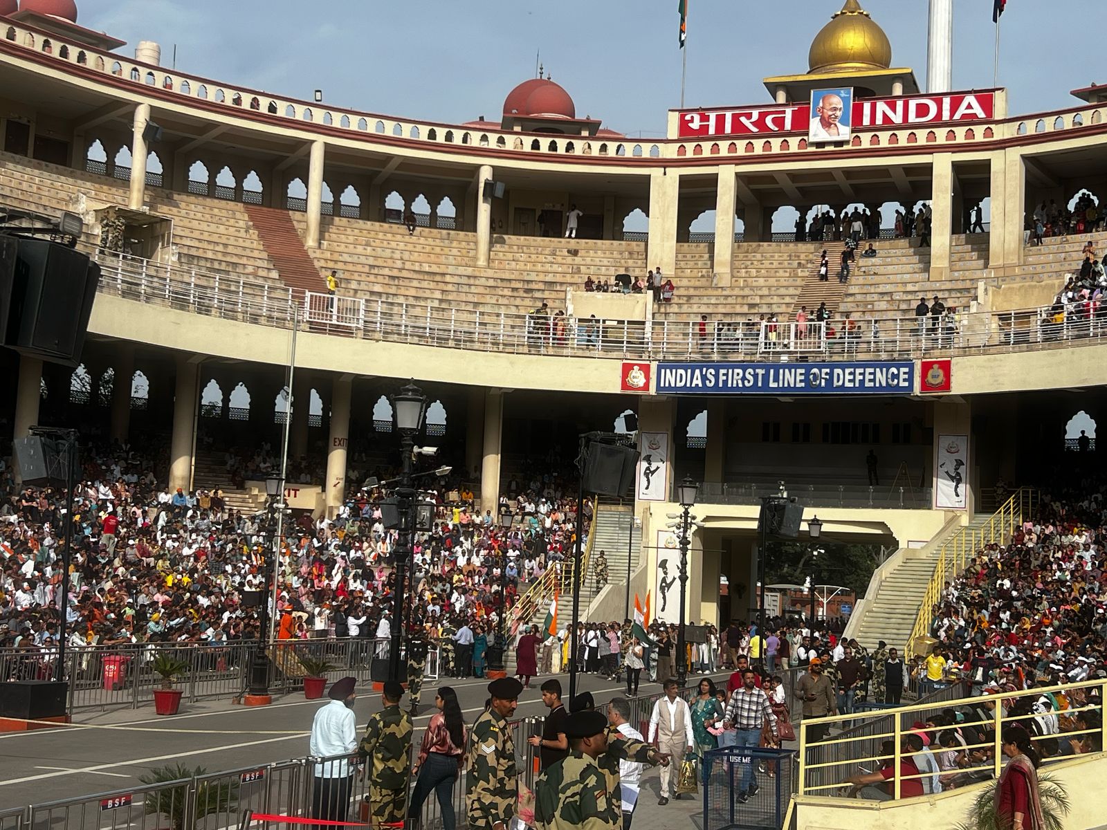 पूछने पर पता चला कि पाकिस्तानी साइड ज्यादा दर्शक नहीं आते. अधिकांश विदेशी पर्यटक होते हैं और भारत और पाकिस्तान के बीच हर रोज होने वाले इस समारोह को देखने आते हैं. पाकिस्तान की तरफ भी भारत की ही तर्ज पर स्टेडियम बनाया जा रहा है और ऊंचा झंडा लगाया जा रहा है.