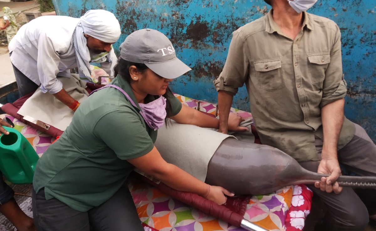 उत्तर प्रदेश के जौनपुर की एक नहर में फंसी गंगा नदी डॉल्फ़िन का रेस्क्यू करते टीएसए फ़ाउंडेशन इंडिया की टीम और स्थानीय लोग.