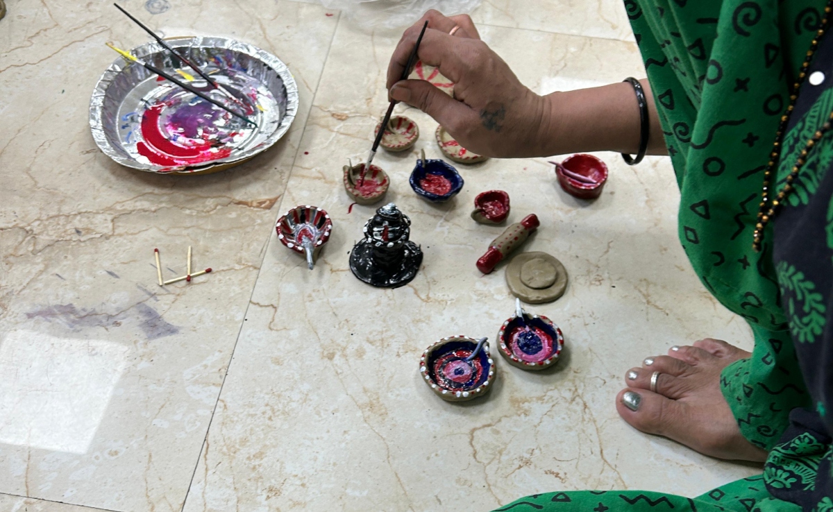 आज 50 साल की शिल्पा (बदला हुआ नाम) पुलिस चौकी के पहले फ्लोर पर पहुंची है. उनके साथ करीब 30 और महिलाएं भी हैं. इस कमरे में पुलिस का डर नहीं है. उसके सामने डिब्बों में रंग और आकृतियां बनाने के लिए चिकनी मिट्टी रखी है. इन महिलाओं से कहा गया है कि वे अपने मनपसंद रंग चुनें और अपनी कल्पना के अनुसार आकृतियां बनाएं. यह केवल एक कला वर्कशॉप नहीं, बल्कि मानसिक स्वास्थ्य को लेकर 'तिनका तिनका फाउंडेशन', राजीव गोयल और दिल्ली पुलिस द्वारा आयोजित एक अनूठी पहल है. इस वर्कशॉप का मकसद इन महिलाओं को उनकी जिंदगी के बासीपन और तकलीफ से बाहर निकालकर उन्हें सृजन की दुनिया से जोड़ना है. जब ये महिलाएं अपनी उंगलियों से रंगों को छूती हैं और मिट्टी को आकार देती हैं तो उनके चेहरे पर सालों बाद सहज खुशी नजर आती है. इस वर्कशॉप की एक और खास बात रही. यहां इन महिलाओं के साथ उनके बच्चे भी आए थे. बच्चों ने जो हुनर पेश किया, वो देखने लायक था, उम्मीद से परे था. दरअसल, दिल्ली पुलिस इन बच्चों के लिए स्तंभ की तरह खड़ी है. हालिया, गर्मियों की छुट्टियों के वक्त इन बच्चों के लिए एक महीने का विशेष कैम्प आयोजित किया गया था. यहां उन्हें चिकनी मिट्टी से खिलौने बनाने का प्रशिक्षण दिया गया. अब ये बच्चे हर शाम इसी चौकी की पहली मंजिल पर आते हैं. इन बच्चों को यहां प्रशिक्षण मिलता है या ये नियमित तौर पर पढ़ाई करते हैं.