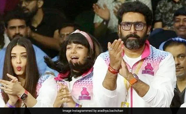 ऐश्वर्या राय बच्चन, नव्या नवेली नंदा, आराध्या बच्चन और अभिषेक बच्चन ने गुरुवार को प्रो कबड्डी सेमीफाइनल मैच में शिरकत की. अभिषेक की कबड्डी टीम जयपुर पिंक पैंथर्स के लिए ऐश्वर्या, नव्या और आराध्या जमकर चीयर करते नजर आए. अभिषेक की टीम फाइनलिस्ट बन गई है, टीम के एक खिलाड़ी के साथ भी ऐश्वर्या और अभिषेक की तस्वीर सामने आई हैं. इंस्टाग्राम पर शेयर हुई तस्वीरों में ऐश्वर्या, अभिषेक और आराध्या जयपुर पिंक पैंथर्स की जर्सी में नजर आ रहे हैं. ऐश्वर्या ने ब्लैक पैंट के साथ जर्सी को टीमअप किया, जबकि अभिषेक और आराध्या ब्लू जींस के साथ जर्सी पहने दिखे.