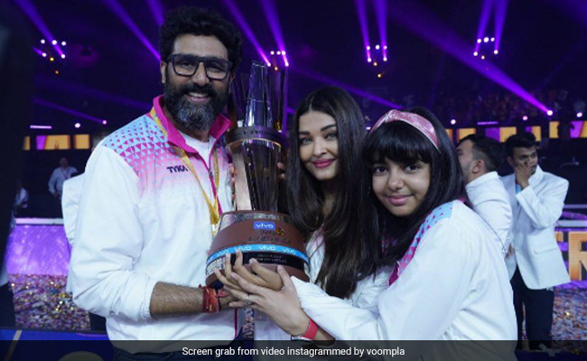 अभिषेक बच्चन शनिवार को प्रो-कबड्डी लीग में अपनी टीम जयपुर पिंक पैंथर्स की ट्रॉफी जीतने के बाद बहुत खुश थे. वायरल हो रहे एक वीडियो में देखा जा सकता है कि अभिषेक आराध्या और ऐश्वर्या को कसकर गले लगा रहे हैं. ऐश्वर्या भी चिल्लाकर अभिषेक के साथ सेलिब्रेट करती दिख रही हैं. एक अन्य फोटो में आराध्या को ट्रॉफी उठाते और उसके साथ पोज देते देखा जा सकता है. ऐश्वर्या राय फैन क्लब प्रोफाइल से कई फोटोज शेयर की गई हैं. इसके साथ कैप्शन लिखा है, जयपुर पिंक पैंथर्स प्रो कबड्डी सीजन 9 चैंपियन हैं. क्या शानदार मौसम है! हमें अविश्वसनीय रूप से प्रतिभाशाली, डेडिकेटेड और मेहनती कबड्डी खिलाड़ियों की अपनी टीम पर बहुत गर्व है...!! ईश्वर की कृपा सदैव बनी रहे