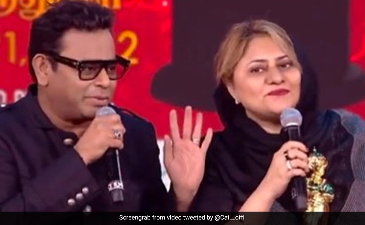 इन दिनों सोशल मीडिया पर ए.आर. रहमान का वीडियो काफी सुर्खियां बटोर रहा है. इस वीडियो में एआर रहमान ने एक अवॉर्ड फंक्शन के दौरान अपनी वाइफ को कुछ ऐसा कहा जिसे सुनकर वो शर्म से लाल हो गईं. दरअसल हाल ही में एआर रहमान स्टेज पर एक अवॉर्ड को रिसीव करने के लिए अपनी वाइफ सायरा बानो के साथ पहुंचे थे, इस दौरान रहमान तो फ्लुएंट तमिल भाषा में बोलते नजर आए, लेकिन जब माइक अपनी वाइफ को थमाया तो इसके बाद उनकी पत्नी ने क्या जवाब दिया आप खुद ही सुन लीजिए.