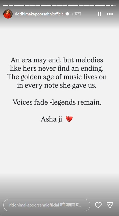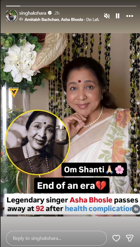 Deeply saddened by the news of Asha Bhosle ji’s passing. Her magical voice was the heartbeat of Indian cinema for decades and touched millions of hearts. She leaves behind a legacy that will live on for generations and will always be remembered with respect and love. My deepest… pic.twitter.com/U81F2NBBeD