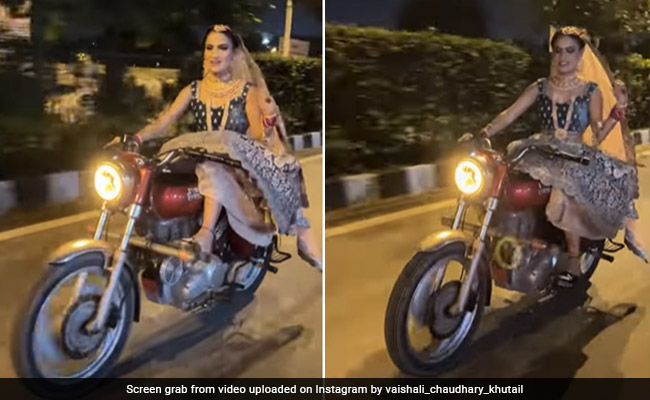 सोशल मीडिया पर वैशाली चौधरी खुटेल का वीडियो वायरल हो रहा है, वीडियो में शादी का जोड़ा पहने वैशाली रॉयल एनफील्ड बुलेट चला रही है. बड़े ही आराम से वैशाली लहंगा पहने रॉयल एनफील्ड बुलेट को दौड़ाती हैं. उनका स्टाइल सोशल मीडिया यूजर्स का ध्यान खींचने में कामयाब रहा है. लहंगे के साथ सिर पर दुपट्टा ओढे वैशाली ने पैरों में फ्लिप फ्लॉप पहनी हुई है. हरियाणवी गाने पर अपना स्वैग दिखाती वैशाली बुलेट पर बैठे-बैठे पोज भी देती हैं.