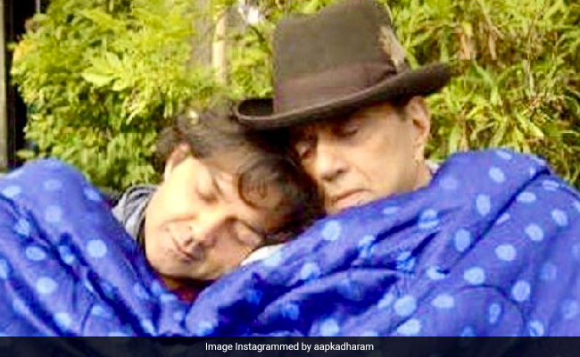 धर्मेंद्र किसी भी युवा सितारे की अपेक्षा सोशल मीडिया पर ज्यादा एक्टिव रहते हैं. वह अकसर अपनी जिंदगी के कई अनदेखे पहलुओं की फोटो शेयर करते हैं. धर्मेंद्र की इन फोटो को फैन्स का खूब प्यार भी मिलता है. बॉलीवुड में ही-मैन के नाम से फेमस धर्मेंद्र ने एक लेटेस्ट फोटो अपने इंस्टाग्राम पर शेयर की है. इस फोटो में धर्मेंद्र को अपने छोटे बेटे बॉबी देओल के साथ देखा जा सकता है. इस फोटो में बाप-बेटे ने नीले रंग की रजाई ले रखी है और सुकून के साथ सो रहे हैं.