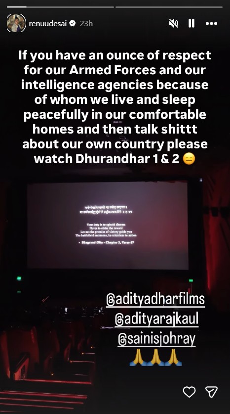 एक्ट्रेस और साउथ सुपरस्टार पवन कल्याण की एक्स वाइफ रेनू देसाई ने इंस्टाग्राम पर आदित्य धर की धुरंधर का रिव्यू शेयर किया है. उन्होंने लिखा, “अगर आपके मन में हमारी सेना और हमारी इंटेलिजेंस एजेंसियों के लिए जरा भी इज्जत है, जिनकी वजह से हम अपने आरामदायक घरों में चैन से रहते और सोते हैं और फिर भी आप अपने ही देश के बारे में बकवास करते हैं, तो प्लीज ‘धुरंधर 1 और 2’ जरूर देखें. आपका फर्ज है कि आप धर्म का पालन करें, कभी भी फल की इच्छा न करें. जीत का वादा आपको गुमराह न करे. युद्ध का मैदान आपको पुकार रहा है, अपने कर्मों में अडिग रहें. भगवद गीता—अध्याय 2, श्लोक 47.” इसके अलावा उन्होंने खुद को बीजेपी और पीएम मोजी जी का गर्वित अंधभरक्त बताया है.