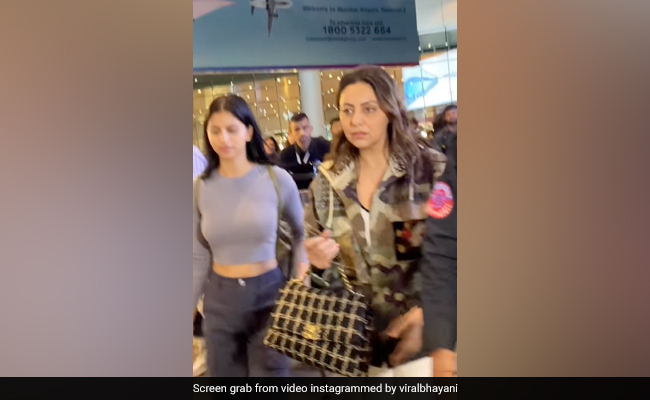 सुहाना खान और गौरी खान कुछ घंटे पहले ही दुबई में एक इवेंट अटैंड करके मुंबई लौटी हैं. इस दौरान वह एयरपोर्ट पर स्पॉट हुईं, जिसके पैपराजी ने एक वीडियो शेयर की है. वीडियो में गौरी खान वाइट पैंट और टॉप के साथ एक जैकेट करती हुई दिख रही हैं. इस दौरान वह नो मेकअप लुक में दिख रही हैं. हालांकि वह फोटो और वीडियो क्लिक करवाने के लिए मना करती हुई नजर आ रही हैं. दूसरी तरफ ब्लू जींस और मैचिंग क्रॉप टाप में सुहाना खान पैपराजी को क्यूट स्माइल देते हुए नजर आ रही हैं.
