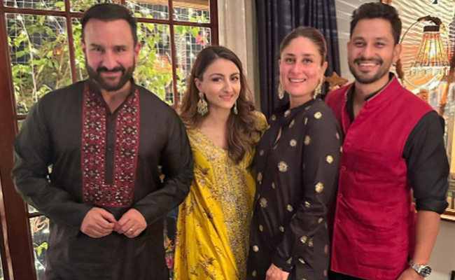 इस मौके पर सैफ और करीना ब्लैक आउटफिट में दिखे. जहां उन्होंने लाल जूती के साथ काले रंग की गोल्डन प्रिंट वाला सूट पहना है तो वहीं सैफ ने सफेद पायजामा और काले जूते के साथ काले और लाल रंग के कुर्ते को चुना है. सोहा ने पीले रंग का सूट पहना है, जबकि कुणाल ने लाल जैकेट के साथ काले रंग की ड्रेस पहनी है.