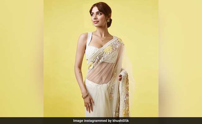 एथनिक लुक्स की बात हो रही हो खुशी कपूर के इस लेटेस्ट साड़ी लुक पर जरूर नजर डालनी चाहिए. क्रीम कलर की इस एम्ब्रॉयडरी वाली नेट साड़ी में खुशी का लुक काफी रॉयल नजर आ रहा है. स्लीक बन और स्टोन इयररिंग्स के साथ उन्होंने अपने लुक को कंप्लीट किया है.