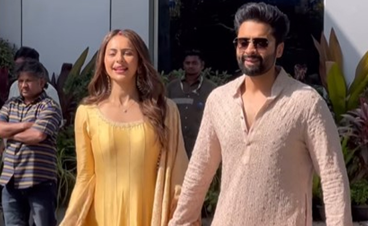 गोवा में एक शानदार शादी के बाद न्यूली मैरिड कपल रकुल प्रीत सिंह और जैकी भगनानी वापस मुंबई आ गए हैं. शुक्रवार 23 फरवरी को मिस्टर और मिसेज भगनानी को मुंबई एयरपोर्ट पर देखा गया. रकुल और जैकी दोनों ही एथनिक लुक में नजर आए जो कि फैन्स को काफी पसंद भी आया. रकुल गोल्डन दुपट्टे के साथ पीले अनारकली सेट में खूबसूरत लग रही थीं. दूसरी तरफ जैकी ने क्रीम कलर का कुर्ता पजामा पहना हुआ था. एयपोर्ट पर इस कपल ने पैपराजी और मीडिया को गिफ्ट हैम्पर्स बांटे. पैपराजी भी रकुल और जैकी से मिलकर काफी एक्साइटेड थे.