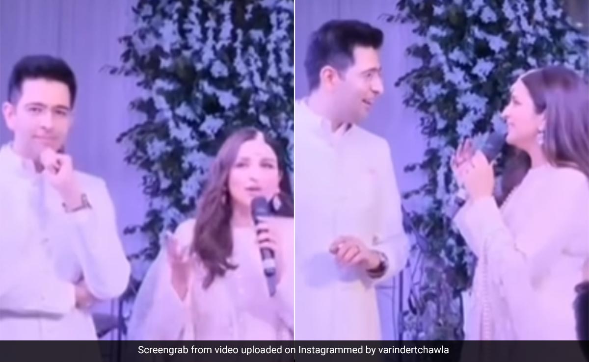 वीडियो में सिंगर मीका सिंह कपल को स्टेज पर ले जाते हुए दिख रहे हैं. राघव की ओर इशारा करते हुए, परिणीति ने अपने परिवार से पूछती हैं, "हुन ठीक है?" चोपड़ा परिवार जोर से हां में जवाब देते हैं. इसके बाद परिणीति अपने ससुराल चड्ढा फैमिली को कहती हैं. "अब चड्ढा, क्या आप मंजूर करते हैं?" परिवार भी खुशी के साथ जवाब देता है. इस बातचीत में राघव चड्ढा शर्माते हुए नजर आते हैं. वहीं परिणीति को यह कहकर चिढ़ाया जाता है कि चड्ढा की आवाज ज्यादा तेज थी, जिस पर परिणीति अपनी फैमिली को जोर से चिल्लाने के लिए कहती हैं. इतना ही नहीं आगे वीडियो में मीका मेरा लौंग गवाचा गाते हैं, जिसमें एक्ट्रेस भी साथ देती हुई दिखती हैं.