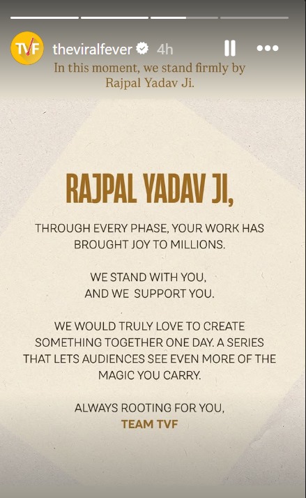 ‘पंचायत’, ‘कोटा फैक्ट्री’, ‘गुल्लक’ जैसे कई आइकॉनिक शो के मेकर्स द वायरल फीवर (TVF) ने भी राजपाल यादव की इस मुश्किल घड़ी में उनकी मदद करने का फैसला किया है. राजपाल यादव को 9 करोड़ लोन डिफॉल्ट मामले में जेल की सजा सुनाई गई, जिसके बाद सलमान खान, अजय देवगन और वरुण धवन जैसे सितारों ने उनका समर्थन किया. अब टीवीएफ ने भी एक्टर के साथ खड़े होने का फैसला लिया है और इस मुश्किल समय में उनका साथ देने का वादा किया है, साथ ही उनके साथ काम करने की इच्छा भी जताई है. अपने सोशल मीडिया पर TVF ने लिखा: 'इस मुश्किल घड़ी में हम राजपाल यादव जी के साथ मजबूती से खड़े हैं. राजपाल यादव जी, हर दौर में आपके काम ने लाखों लोगों के चेहरे पर मुस्कान लाई है. हम आपके साथ हैं और आपका पूरा समर्थन करते हैं. हम सच में एक दिन आपके साथ कुछ खास बनाना चाहेंगे। एक ऐसी सीरीज़, जिसमें दर्शक आपकी उस जादूगरी को और करीब से देख सकें जो आप अपने साथ लेकर चलते हैं. हमेशा आपके लिए दुआ करते रहेंगे, टीम TVF.'