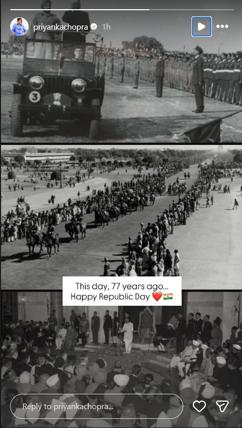 एक्ट्रेस प्रियंका चोपड़ा, जिन्हें ग्लोबल स्टार कहा जाता है. उन्होंने इंस्टाग्राम स्टोरी पर एक पुरानी ब्लैक एंड वाइट फोटो शेयर करके गणतंत्र दिवस की बधाई दी. फोटो के साथ उन्होंने लिखा- .यह दिन 77 साल पहले . हैप्पी रिपब्लिक डे.