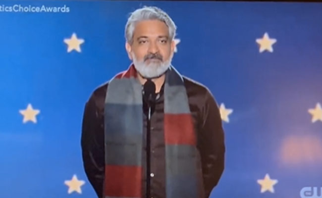 फिल्म निर्देशक एसएस राजामौली इन दिनों फिल्म RRR की शानदार सफलता का आनंद ले रहे हैं. जहां फिल्म के गाने नाटू नाटू ने प्रतिष्ठित गोल्डन ग्लोब अवॉर्ड अपने नाम किया है तो वहीं अब फिल्म ने क्रिटिक्स च्वाइस अवार्ड्स के 28वें संस्करण में दो और अवॉर्ड जीते हैं. बीते दिन यानी सोमवार को टीम 'आरआरआर' ने अपने ट्विटर अकाउंट पर एक वीडियो शेयर किया है, जिसमें एसएस राजामौली को लॉस एंजिल्स में आयोजित पुरस्कार समारोह में अपना जीत पर दो शब्द कहते हुए नजर आ रहे हैं.