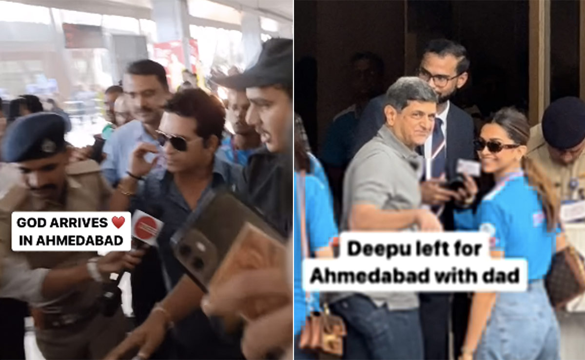 पहली वीडियो दिग्गज सचिन तेंदुलकर की है, जो अहमदाबाद पहुंचते हुए दिख रहे हैं.