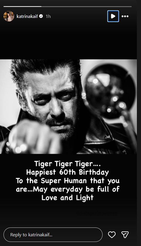 एक्ट्रेस कैटरीना कैफ ने अपने खास दोस्त और को स्टार सलमान खान के लिए बर्थडे पोस्ट शेयर किया है, जिसमें उन्होंने भाईजान की फोटो के साथ लिखा, टाइगर, टाइगर टाइगर... हैप्पी 60th बर्थडे उस सुपर ह्यूमन को जो आप हो. आपका हर दिन प्यार और रोशनी से भरा रहे.