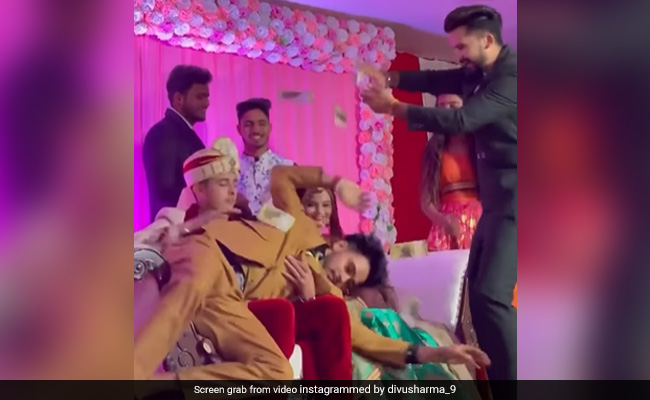 इंस्टाग्राम पर एक वीडियो वायरल हो रहा है. इस वीडियो में दूल्हा और दुल्हन स्टेज पर सोफे पर बैठे दिखाई दे रहे हैं. वहीं इस दौरान दूल्हे के दो दोस्त उसके पास आते हैं. एक दोस्त स्टेज पर चढ़कर ढेर सारे पैसे उड़ाने लगता है, जबकि दूसरा दोस्त दूल्हे के साथ अपनी तस्वीर क्लिक करवाने के लिए सोफे के साइड में बैठने की कोशिश करता है. लेकिन वह ठीक से बैठ नहीं पाता और सबके सामने दूल्हे की गोद में गिर जाता है.