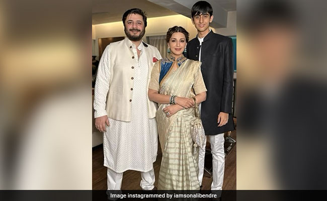 सोनाली बेंद्रे ने इस तस्वीर को शेयर करते हुए फैन्स को दिवाली की बधाई भी दी है. इसे शेयर करते हुए वे लिखती हैं, 'बहल फैमिली आपको दिवाली की ढेरों बधाई देते हैं'. फोटो में जहां सोनाली बेंद्रे एक खूबसूरत सी साड़ी में रॉयल प्रिंसेस की तरह नजर आ रही हैं. वहीं गोल्डी बहल को सफ़ेद और क्रीम कलर की शेरवानी, जबकि बेटे को ब्लैक शेरवानी सूट में देखा जा सकता है. इस तस्वीर में सोनाली के बेटे रणवीर ने सभी का ध्यान अपनी ओर खींच लिया है. फोटो में आप देख सकते हैं कि रणवीर हाइट में अपने पापा से भी लंबे हो गए हैं.