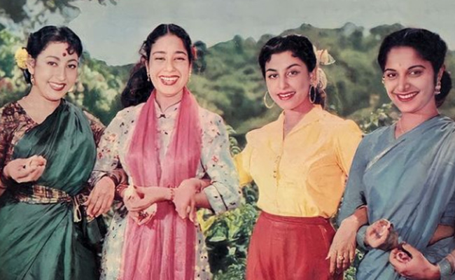 फोटो में दिख रही चारों खूबसूरत हसीनाएं एक समय में फैंस के दिलों की धड़कन रह चुकी हैं. इन चारों का बॉलीवुड पर राज चलता था और इन्होंने एक से बढ़कर यादगार फिल्में दी हैं. फोटो में सबसे पहले ग्रीन साड़ी में माला सिन्हा हैं, दूसरे नंबर पर प्रिंटेड सूट और पिंक दुपट्टे में चांद उस्मानी हैं और तीसरे नंबर पर येलो शर्ट और रेड पैंट पहने हुए एक्ट्रेस जबीन जलील हैं, वहीं चौथे नंबर पर एक्ट्रेस वहीदा रहमान हैं.