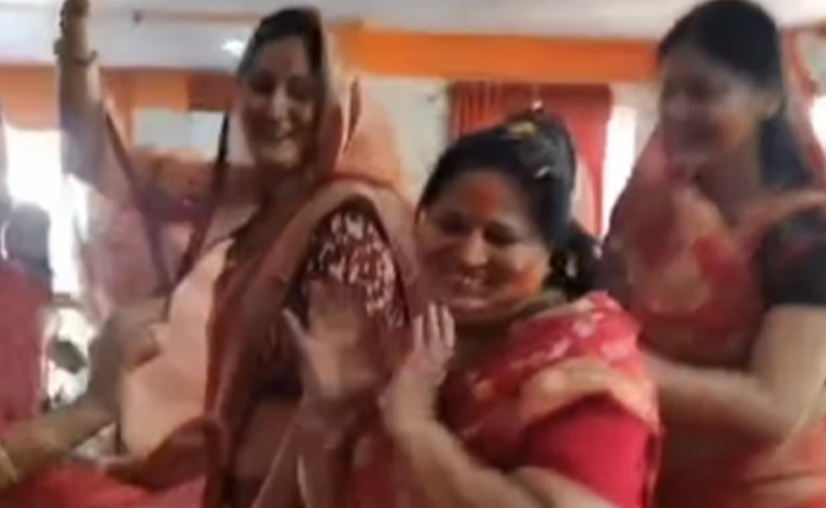 ये वीडियो किसी जागरण या फिर कीर्तन का लग रहा है, जिसमें कई महिलाएं साड़ी में नजर आ रही हैं. वीडियो में बांके बिहारी का एक गाना चल रहा है, जिसमें सभी महिलाएं एक साथ नाच रही हैं. तभी कुछ महिलाएं पास में खड़ी एक दूसरी महिला को नाचने के लिए कहती हैं. हालांकि ये महिला मना कर देती है और पीछे हटती है. इसके बावजूद महिला की दोस्त उसे नाचने के लिए जबरदस्ती खींचती हैं, अब इसके बाद जो कुछ होता है उससे लोगों का हंस हंसकर पेट दर्द हो रहा है.