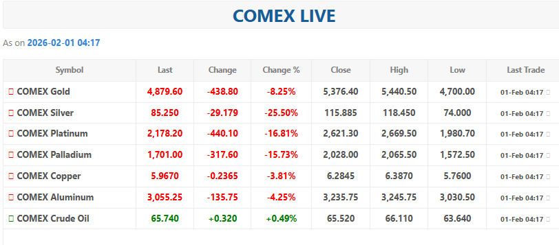 अंतरराष्ट्रीय मार्केट में भी गोल्ड और सिल्वर में जबरदस्त गिरावट देखने को मिली. सोने की कीमत 5 हजार डॉलर प्रति औंस के नीचे आ गई, जो 1980 के दशक की शुरुआत के बाद एक दिन की सबसे बड़ी गिरावट है. सोने और चांदी की कीमतों में गिरावट तब शुरू हुई जब एक रिपोर्ट के बाद अमेरिकी डॉलर में तेजी आई कि डोनाल्ड ट्रंप प्रशासन केविन वॉर्श को US फेडरल रिजर्व के चेयरमैन के लिए नॉमिनेट करने की तैयारी कर रहा है, जिसकी बाद में पुष्टि भी हुई. COMEX के मुताबिक, सोने की कीमत 8.25% गिरकर 4,879.60 डॉलर प्रति औंस पर बंद हुई. चांदी की कीमत 25.5% गिरकर 85.25 डॉलर प्रति औंस पर सेटल हुई.
