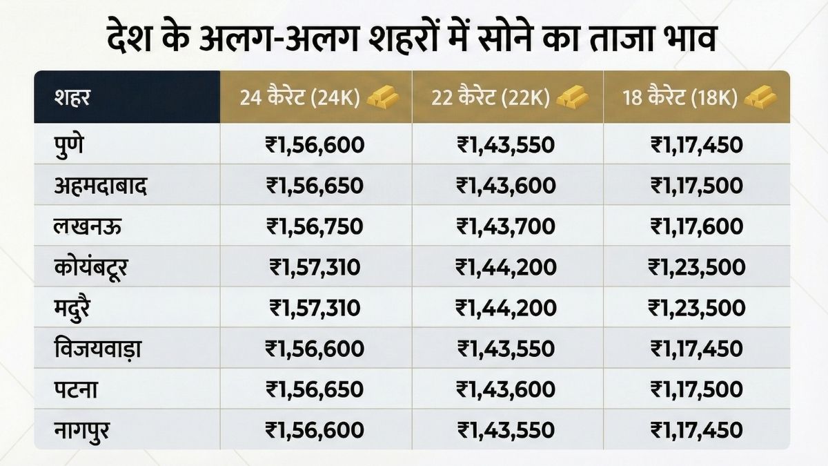 Gold Price Today LIVE in Different Cities: दिल्ली में आज 24 कैरेट सोने का दाम 1,56,750 रुपये/10 ग्राम है, जबकि 22 कैरेट सोना 1,43,700 रुपये/10 ग्राम के भाव बिक रहा है. 18 कैरेट सोने का भाव 1,17,600 रुपये/ 10 ग्राम चल रहा है. मुंबई, कोलकाता और हैदराबाद में 24 कैरेट सोने का दाम, दिल्ली से कम है. नीचे चार्ट में देखिए पूरी डिटेल.