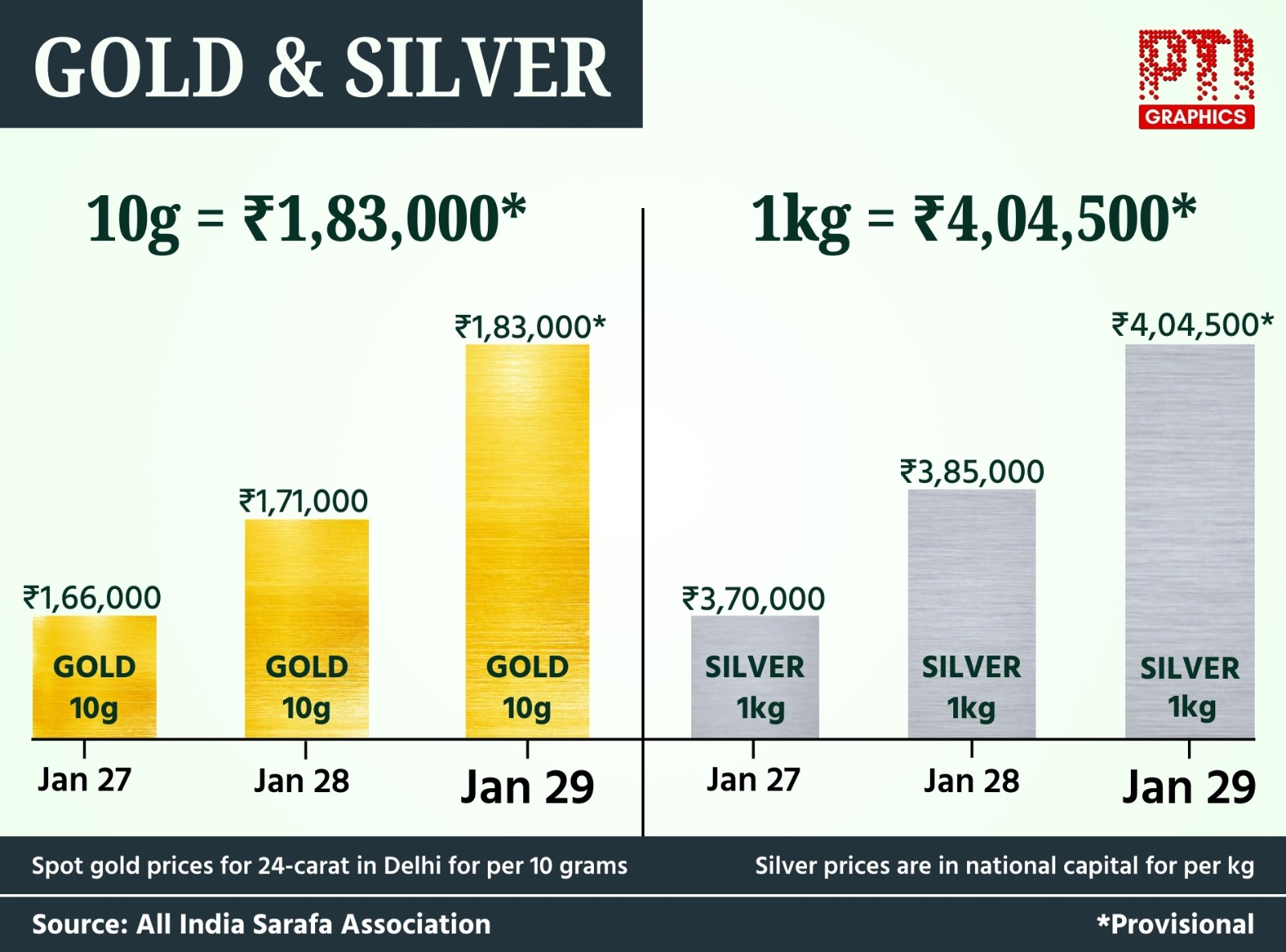 - 27 जनवरी को चांदी का भाव ₹3,70,000 पर थी, वह 29 जनवरी तक ₹4,04,500 के पार निकल गई.