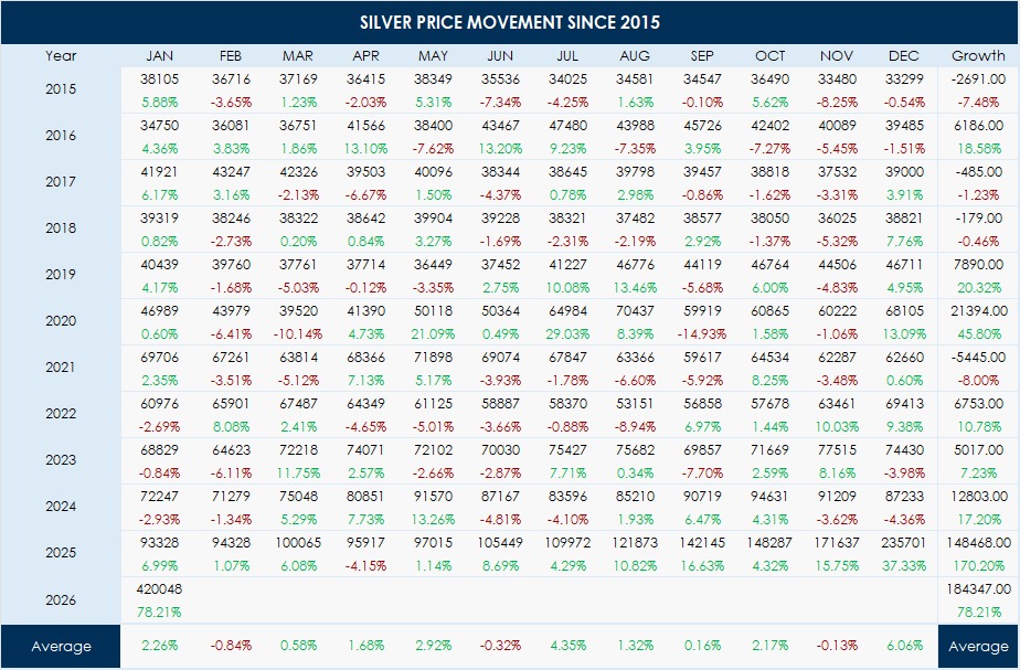 साल 2015 में चांदी जिस भाव पर बिक रही थी, आज उसकी कीमत वहां से कई गुना ऊपर जा चुकी है. इस प्राइस चार्ट के मुताबिक, चांदी ने न केवल अपनी चमक बरकरार रखी है, बल्कि निवेशकों को उम्मीद से कहीं ज्यादा रिटर्न दिया है.