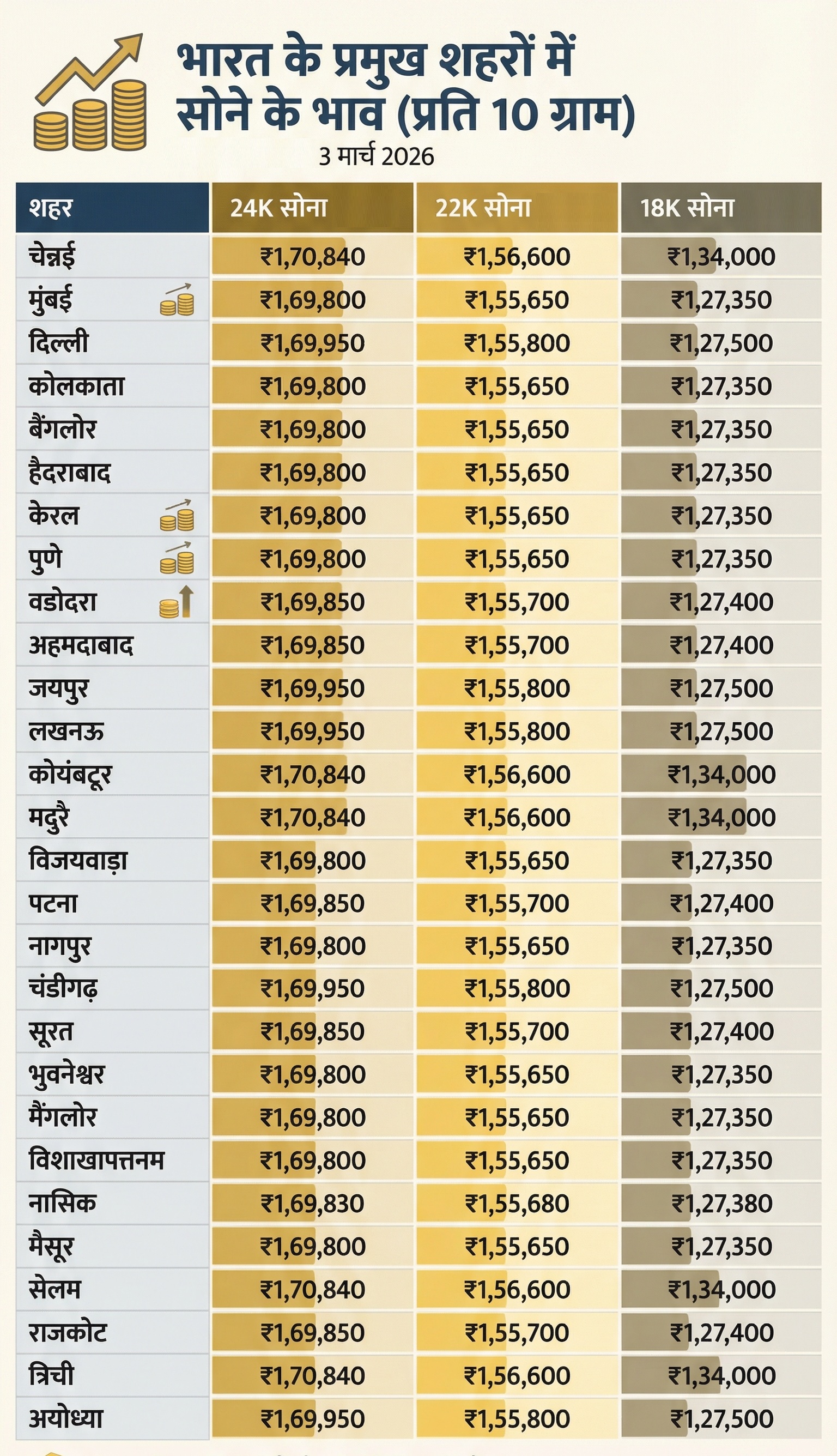 Gold Prices Live: चेन्नई, कोयंबटूर, मदुरै, सेलम और त्रिची जैसे शहरों में 24K सोने की कीमत सबसे अधिक ₹1,70,840 दर्ज की गई है. मुंबई, कोलकाता, बैंगलोर, हैदराबाद और केरल सहित कई शहरों में 24K सोने का भाव एक समान ₹1,69,800 पर बना हुआ है.