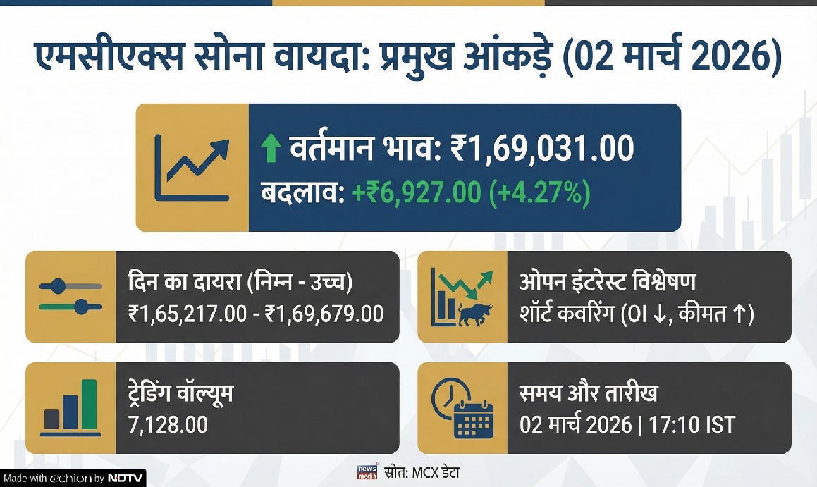 मल्टी कमोडिटी एक्सचेंज (MCX) पर आज सोने और चांदी की कीमतों ने आसमान छू लिया है. निवेशकों में मची अफरातफरी की वजह से सोने और चांदी के भाव में रिकॉर्ड तेजी देखी जा रही है. 2 मार्च 2026 की सुबह MCX पर चांदी की कीमतों में ₹10,002 (3.64%) की ऐतिहासिक बढ़त दर्ज की गई है. इसके साथ ही चांदी का भाव ₹2,85,000 प्रति किलो के स्तर पर पहुंच गया है. MCX पर अप्रैल एक्सपायरी वाले सोने के भाव में ₹4,622 (2.85%) की भारी तेजी आई है. सोना ₹1,66,726 प्रति 10 ग्राम के रिकॉर्ड स्तर पर ट्रेड कर रहा है.