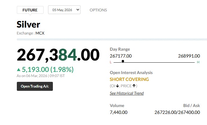 Gold and Silver Rates on 6 March 2026 Live Updates: मिडिल ईस्ट में अमेरिका, इजरायल और ईरान के बीच बढ़ते तनाव ने सोने और चांदी के बाजार में हलचल मचा दी है. बीते दिन मल्टी कमोडिटी एक्सचेंज (MCX) पर गिरावट के बाद, आज यानी 6 मार्च 2026 को सबकी नजरें इस बात पर टिकी हैं कि क्या सोने-चांदी की कीमतों में गिरावट का ये दौर खरीदारी का सही मौका है या आने वाले दिनों में कीमतें और गिरेंगी? बता दें कि युद्ध के माहौल में अक्सर सोना 'सेफ-हेवन' माना जाता है, लेकिन फिलहाल बाजार में सोने-चांदी की कीमतों में जबरदस्त तेजी दिख रही है. कल की गिरावट के बाद, आज यानी 6 मार्च 2026 को बाजार खुलते ही सोने और चांदी की कीमतों में तेजी आई है. मल्टी कमोडिटी एक्सचेंज(MCX ) पर सुबह 9:07 बजे तक सोने का 2 अप्रैल का कॉन्ट्रैक्ट ₹1,243 (0.78%) की बढ़त के साथ ₹1,60,916 प्रति 10 ग्राम पर ट्रेड कर रहा था. वहीं, चांदी की कीमतों में और भी जबरदस्त उछाल आया है. चांदी का 5 मई का कॉन्ट्रैक्ट ₹5,193 (1.98%) महंगा होकर ₹2,67,384 प्रति किलोग्राम के स्तर पर पहुंच गया है.ऐसे में सोने-चांदी के खरीदारों और निवेशकों के मन में अब सबसे बड़ा सवाल यही है कि क्या यह निवेश का सही समय है? क्या अभी युद्ध की आग में और सोना-चांदी और महंगा होगा या इसकी चमक फीकी होगी और आने वाले दिनों में सोना-चांदी सस्ता होगा?