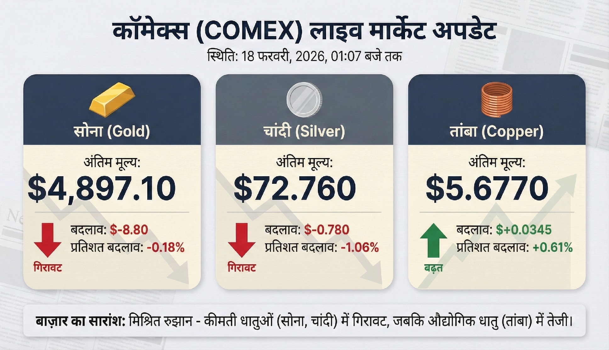 Comex Live Gold-Silver 18 February 2026: कॉमेक्स लाइव आंकड़ों के मुताबिक कीमती धातुओं में मिलाजुला रुख देखने को मिला. सोने की कीमत 4,897.10 डॉलर पर रही, जो 8.80 डॉलर यानी 0.18% की गिरावट दिखाती है. वहीं चांदी में ज्यादा कमजोरी रही और यह 72.760 डॉलर पर 1.06% टूट गई. इसके उलट कॉपर में मजबूती दिखी और यह 0.61% की बढ़त के साथ 5.6770 डॉलर पर पहुंच गया. ट्रेडिंग सेशन में सोने का हाई 4,902.20 और लो 4,868.50 रहा, जबकि चांदी 73.795 से 72.250 के दायरे में रही.