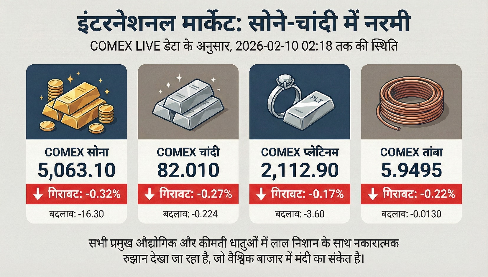 Gold-Silver Prices Comex Live 10 February 2026: इंटरनेशनल मार्केट में सोने-चांदी की कीमतों में हल्की गिरावट देखी गई. Comex पर गोल्ड करीब 0.32% की गिरावट के साथ 5,063 डॉलर/औंस पर ट्रेड करता दिखा. सिल्वर में भी 0.27% की गिरावट देखी गई. चांदी 82.01 डॉलर/औंस पर ट्रेड करती दिखी. प्लैटिनम और कॉपर पर भी दबाव देखा जा रहा है.