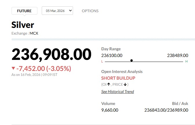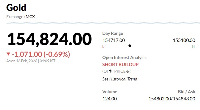 Gold Silver Rates Today 16 February 2026 Live Updates: सुबह 09:45 बजे के ताजा आंकड़ों के मुताबिक, चांदी की कीमतों में 'क्रैश' जैसी स्थिति है. मार्च एक्सपायरी वाली चांदी ₹8,736 (3.58%) की जबरदस्त गिरावट के साथ ₹2,35,624 प्रति किलो पर आ गई है. वहीं, सोने की चमक भी आज फीकी पड़ी है. अप्रैल एक्सपायरी वाला सोना ₹1,647 (1.06%) टूटकर ₹1,54,248 प्रति 10 ग्राम के स्तर पर कारोबार कर रहा है. बाजार खुलते ही आई इस गिरावट ने उन लोगों को खरीदारी का मौका दे दिया है जो पिछले कई दिनों से दाम घटने का इंतजार कर रहे थे.