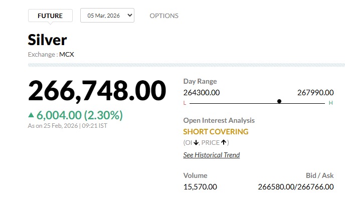 आज सुबह सोने और चांदी की कीमतों में अचानक बड़ी तेजी देखने को मिली है. MCX पर आज सुबह 2 अप्रैल की एक्सपायरी वाला सोना ₹785.00 (0.49%) की बढ़त के साथ ₹1,60,754.00 पर पहुंच गया है. वहीं, चांदी की कीमतों में भी जबरदस्त उछाल आया है. 5 मार्च की डिलीवरी वाली चांदी सुबह 9:21 बजे तक ₹6,004.00 (2.30%) की भारी मजबूती के साथ ₹2,66,748.00 के स्तर पर कारोबार कर रही है.