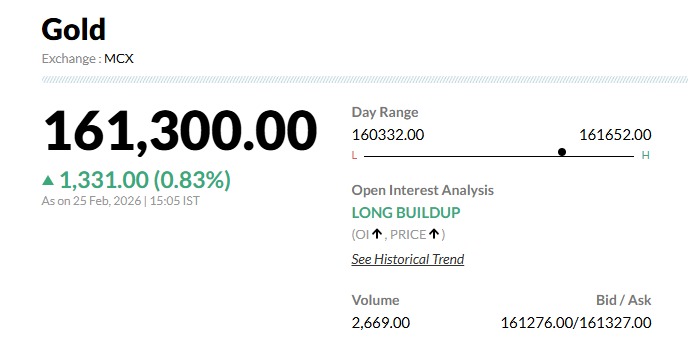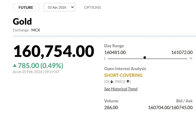 एमसीएक्स पर सोने में आज निवेशक लगातार खरीदारी कर रहे हैं. बीते दिन जहां हल्की मुनाफावसूली देखी गई थी, पर आज लिवाली ने गोल्ड की कीमतों को 1 लाख 60 हजार के पार पहुंचा दिया है.