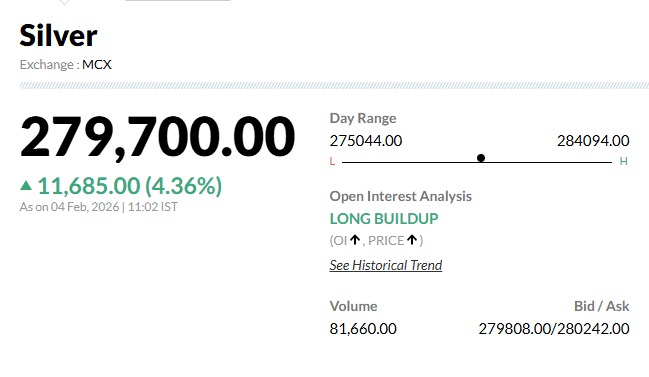 वहीं, MCX पर 5 मार्च 2026 एक्सपायरी वाली चांदी भी तेज उछाल के साथ कारोबार कर रही है. सुबह 09:35 बजे चांदी का भाव ₹2,81,317 प्रति किलो दर्ज किया गया. इसमें ₹13,302 यानी करीब 4.96% की तेजी आई है. चांदी आज ₹2,78,015 प्रति किलो पर खुली थी, जबकि इसका पिछला बंद भाव ₹2,68,015 प्रति किलो था.