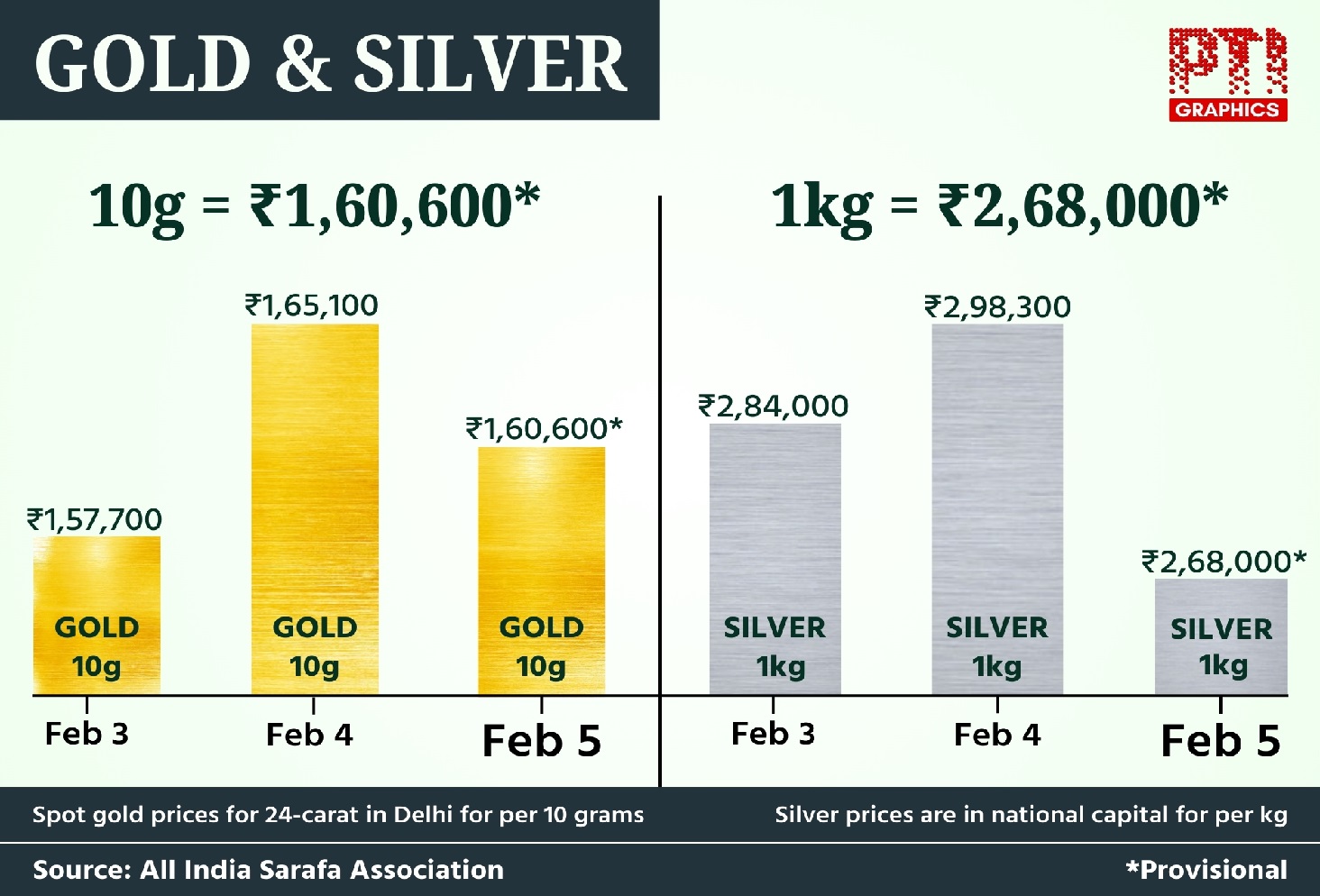 ऑल इंडिया सर्राफा एसोसिएशन ने सोने-चांदी की जो दरें जारी की, उसके मुताबिक, सोने का भाव 1,65,100 रुपये/10 ग्राम से गिरकर 1,60,600 रुपये/10 ग्राम पर आ गया. वहीं चांदी की कीमत 4 फरवरी के भाव 2,98,300 रुपये/10 से करीब 30,000 रुपये गिर कर 2,68,000 रुपये/10 ग्राम रह गई है. 3 फरवरी को सोने और चांदी का भाव 1,57,700 रुपये/10 ग्राम था, जबकि चांदी भी गिर कर 2,84,000 रुपये/किलो पर पहुंच गई थी.