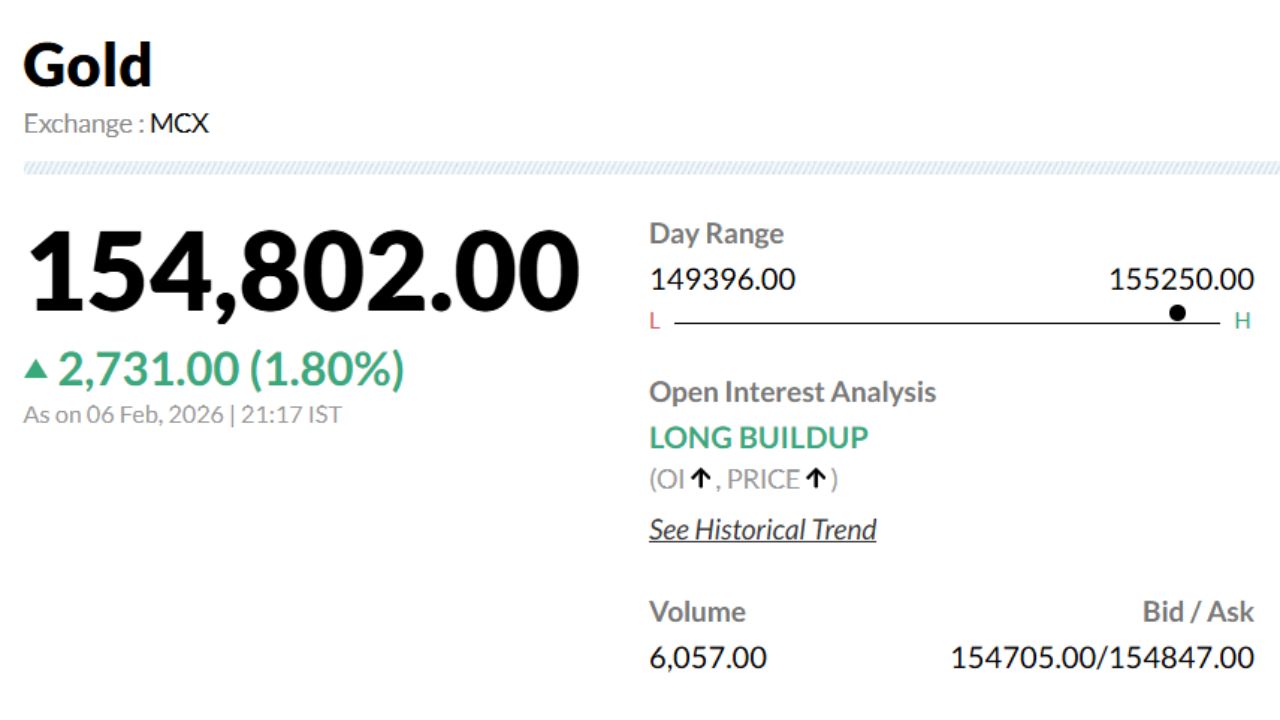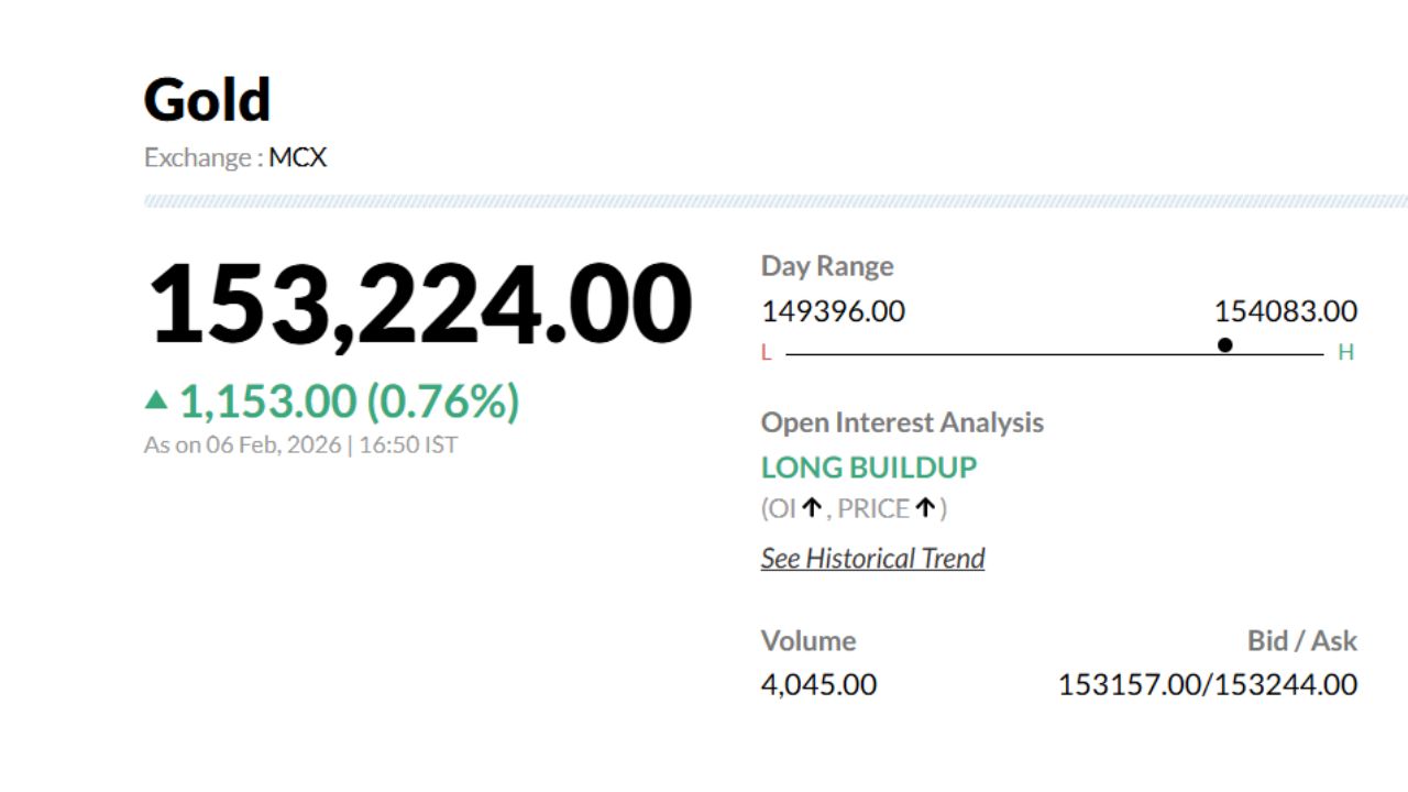 Gold Prices Crash 6 February 2026 MCX: रिकॉर्ड हाई पर पहुंचने के बाद जारी गिरावट के बाद सोने में दो दिन पहले जो थोड़ा उछाल आया था, वो फिर से गिरावट की ओर बढ़ रहा है. आज 6 फरवरी को सोने के भाव में बदलाव की बात करें तो एक बार फिर इसमें करीब 1,500 रुपये की गिरावट देखी जा रही है. सुबह 10:44 बजे MCX पर अप्रैल डिलीवरी वाला सोना 1,50,585 रुपये/10 ग्राम के भाव पर ट्रेड करता दिखा.
