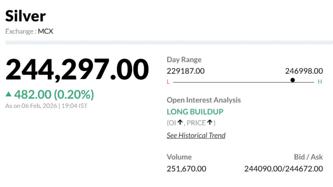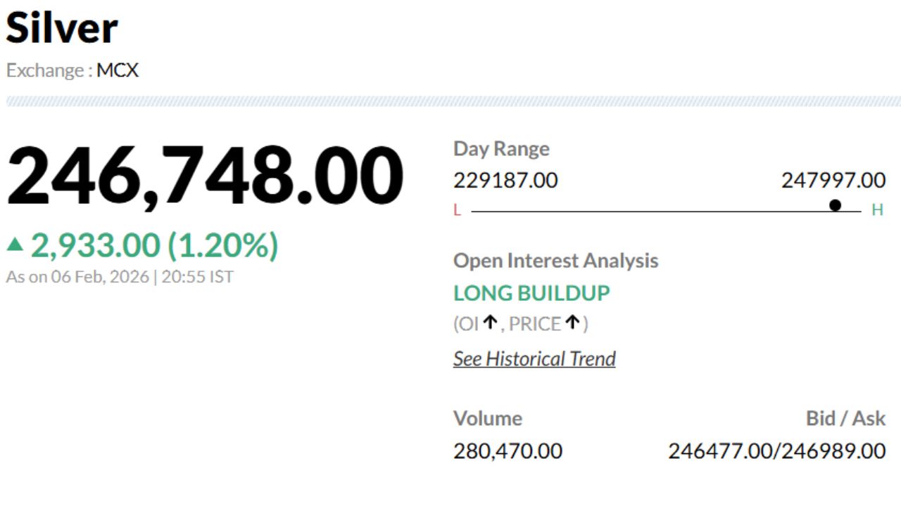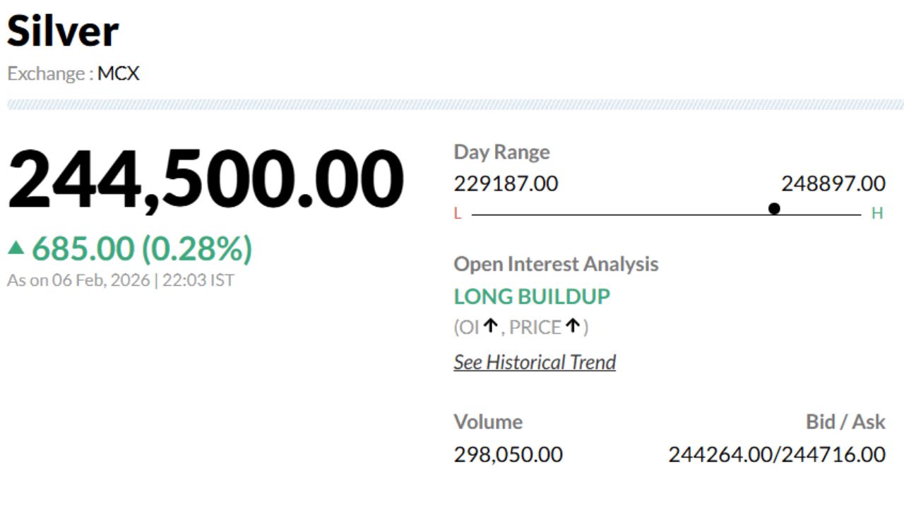 शुक्रवार को एक बार फिर चांदी के भाव में गिरावट देखी जा रही है. गुरुवार को 2,43,815 रुपये/किलो पर क्लोज हुई मार्च डिलीवरी वाली चांदी शुक्रवार को 2,34,063 रुपये/किलो के भाव पर खुली थी, जबकि 1 घंटे के भीतर इसमें 9,859 रुपये तक की गिरावट देखी गई. सुबह 10:14 बजे चांदी 2,33,106 रुपये/किलो के भाव पर ट्रेड कर रही थी.