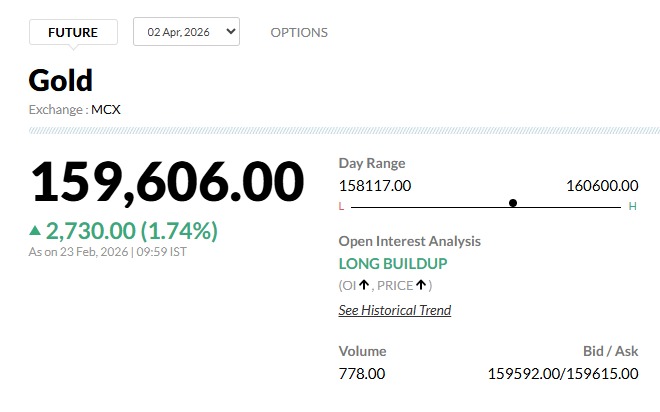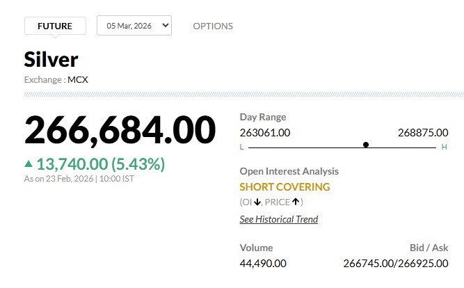 हफ्ते के पहले ही दिन एमसीएक्स (MCX) पर सोने और चांदी की कीमतों ने निवेशकों के होश उड़ा दिए हैं. आज यानी 23 फरवरी 2026 को सुबह 09:06 बजे तक सोना₹3,023.00 (1.93%) की भारी बढ़त के साथ ₹1,59,899.0 प्रति 10 ग्राम पर पहुंच गया है.आज यानी 23 फरवरी 2026 को सोने और चांदी की कीमतों में भारी उछाल ने निवेशकों को चौंका दिया है. मल्टी कमोडिटी एक्सचेंज (MCX) पर चांदी आज सुबह 09:05 बजे तक ₹15,176.00 (6.00%) की जबरदस्त तेजी के साथ ₹2,68,120.00 प्रति किलो के नए रिकॉर्ड स्तर पर पहुंच गई है.