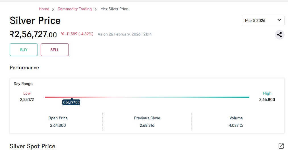 Gold Silver Price February 26 Updates: सोने और चांदी की कीमतों में इन दिनों जबरदस्त हलचल देखने को मिल रही है. अगर आप सोने-चांदी की खरीद करने की सोच रहे हैं तो आज 26 फरवरी के ताजा रेट जरूर चेक करे.बीते एक साल में सोने ने करीब 80% और चांदी ने 180% से ज्यादा का बंपर रिटर्न देकर निवेशकों को मालामाल कर दिया है. हालांकि, पिछले कुछ दिनों से कीमतों में काफी उतार-चढ़ाव बना हुआ है. शादियों का सीजन होने के कारण दिल्ली और मुंबई जैसे बड़े शहरों में 22K और 24K सोने की मांग बढ़ी है, लेकिन कीमतों में भारी उठापटक ने खरीदारों को उलझन में डाल दिया है. ग्लोबल टेंशन और सेफ हेवन एसेट की बढ़ती डिमांड के चलते बाजार में अनिश्चितता बनी हुई है. मल्टी कमोडिटी एक्सचेंज MCX में गुरुवार को चांदी की कीमतों में भारी गिरावट देखने को मिली.दोपहर तक मार्च डिलीवरी वाली चांदी ₹11,261.00 (4.20%) की बड़ी गिरावट के साथ ₹2,57,055.00 के स्तर पर आ गई है. MCX पर 2 अप्रैल 2026 की डिलीवरी वाला सोना दोपहर के समय ₹1,871. (1.16) की गिरावट के साथ ₹159,274 के स्तर पर आ गया.