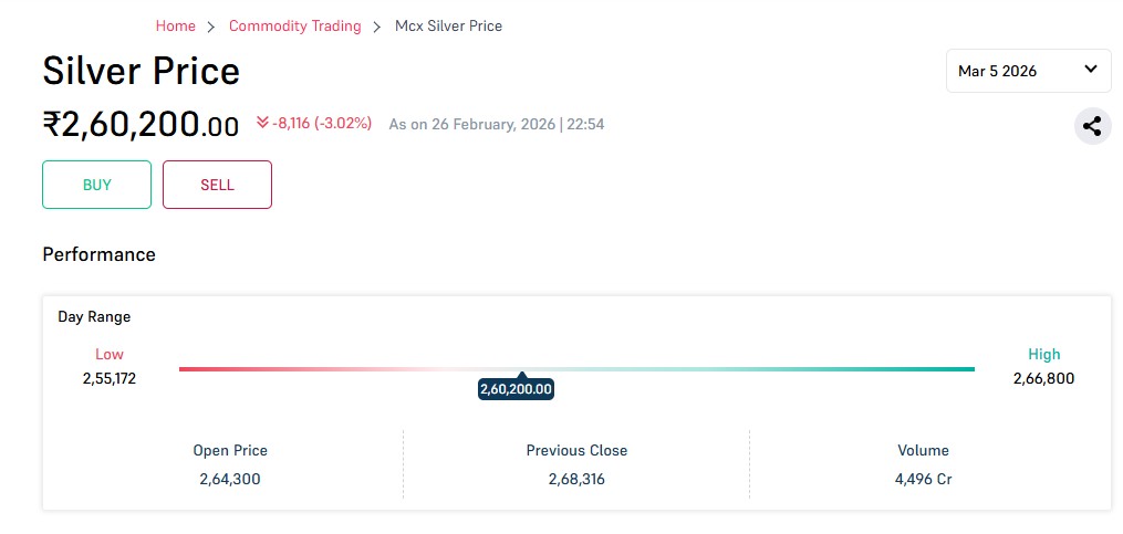 चांदी का भाव गिरकर 2.60 लाख रुपये से भी नीचे पहुंच गया है. MCX पर ताजा भाव 2,59,849 रुपये है.